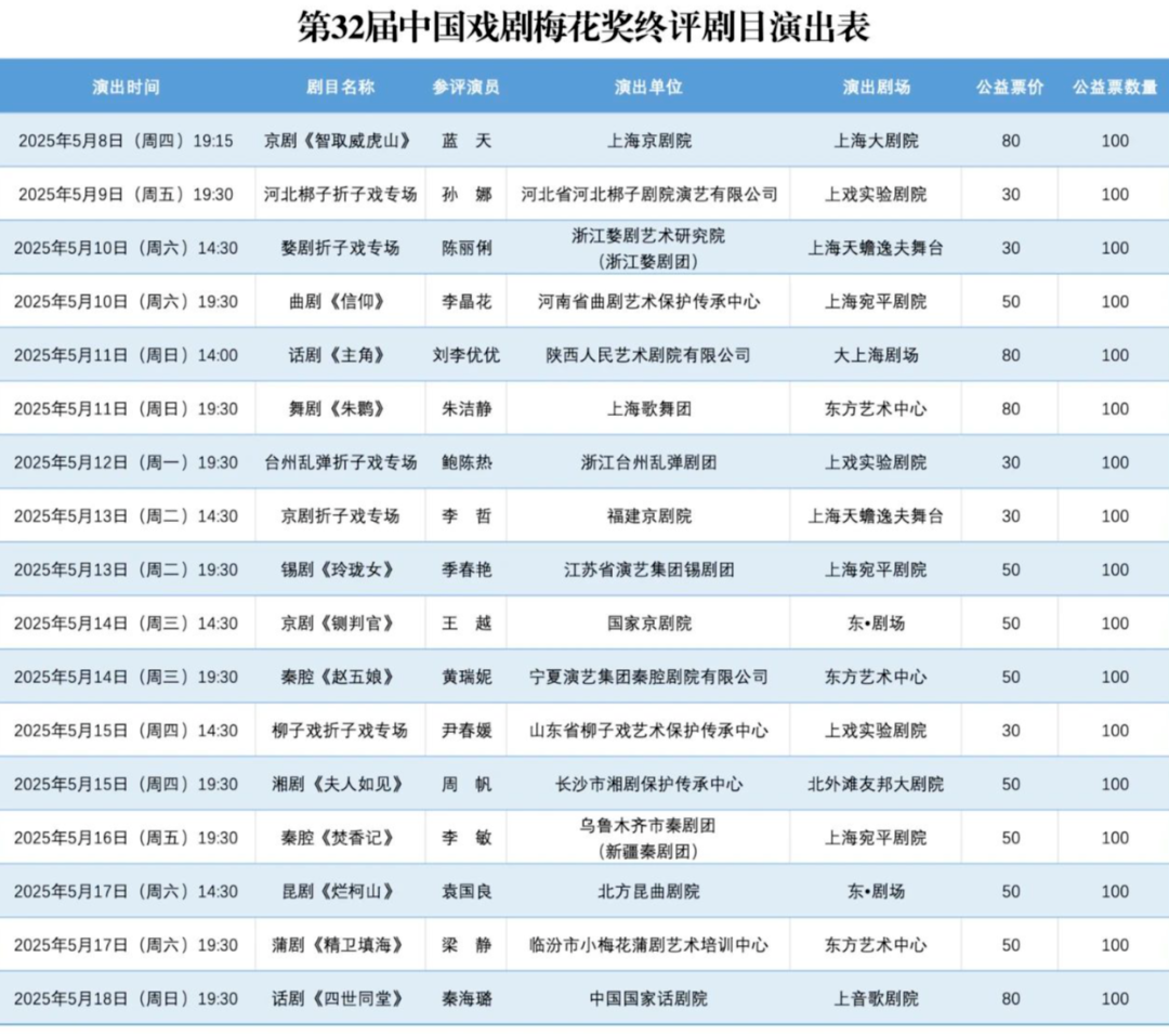 本次梅花奖演出票务将采用市场运营与惠民公益相结合的方式,各场次公益票计划于2025年4月26日10:00统一开售,票价30元至80元不等,每场100张。可扫描文末二维码进入梅花奖终评剧目购票小程序,进入各剧院购票系统购买。