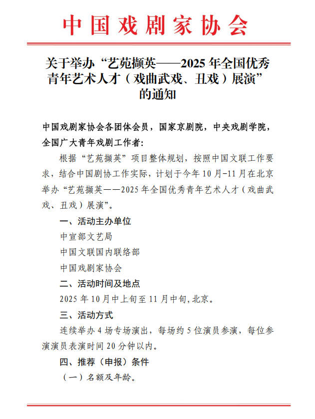 关于举办“艺苑撷英——2025年全国优秀青年艺术人才(戏曲武戏、丑戏)展演”的通知