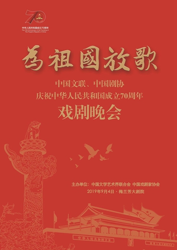 为深入学习贯彻习近平新时代中国特色社会主义思想,回顾新中国成立70年来波澜壮阔的伟大历史进程,歌颂我党坚定不移带领全国人民谋幸福、带领中华民族谋复兴的光辉成就,为新中国成立70周年献礼,由中国文学艺术界联合会、中国戏剧家协会联合主办的“为祖国放歌——中国文联、中国剧协庆祝中华人民共和国成立70周年戏剧晚会”将于9月4日晚在梅兰芳大剧院上演,老中青戏剧家汇聚一堂、星光璀璨;京剧、昆曲、话剧、歌剧、舞剧等11大剧种联袂演出,异彩纷呈。