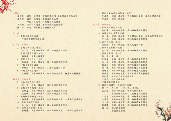 此次晚会分为“革命岁月”“经典华章”“时代画像”三个篇章。中国文联副主席、中国剧协主席濮存昕以及李树建、沈铁梅、茅威涛、孟广禄、柳萍、韩再芬等剧协主席团成员与瞿弦和、宋国锋、曾昭娟、王晓梅、王蓉蓉、么红、吴京安、贾文龙、袁慧琴、于兰、李小雄、刘晓翠、王艳、陈小朵、王斑、张馨月、侯岩松、张建峰、赵旭、单雯等二十余位梅花奖获得者,以及郑培钦、章益清、颜丹晨、李小萌、王乐君等优秀中青年演员二百余人参加演出。