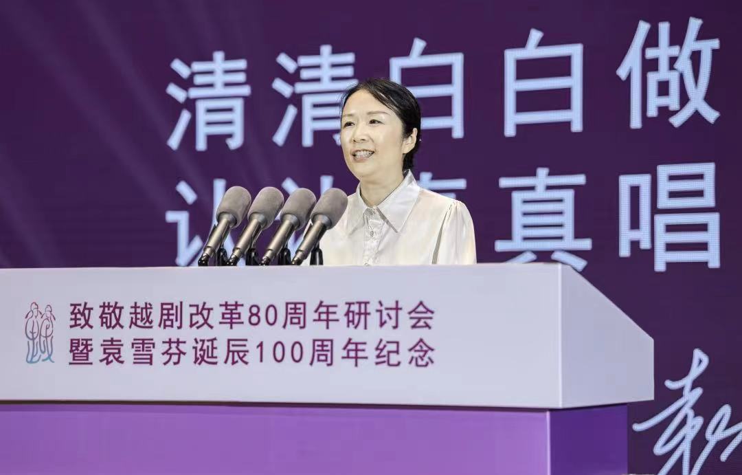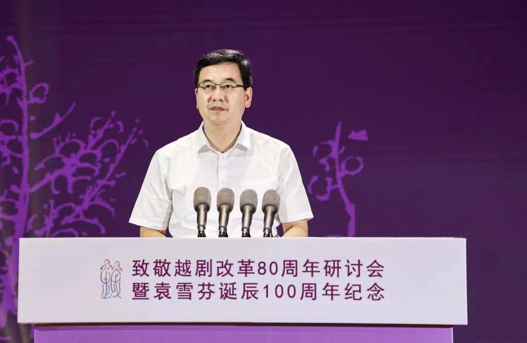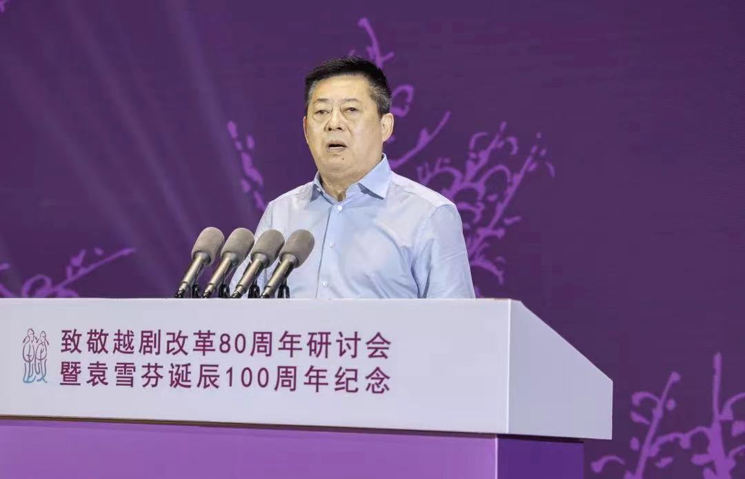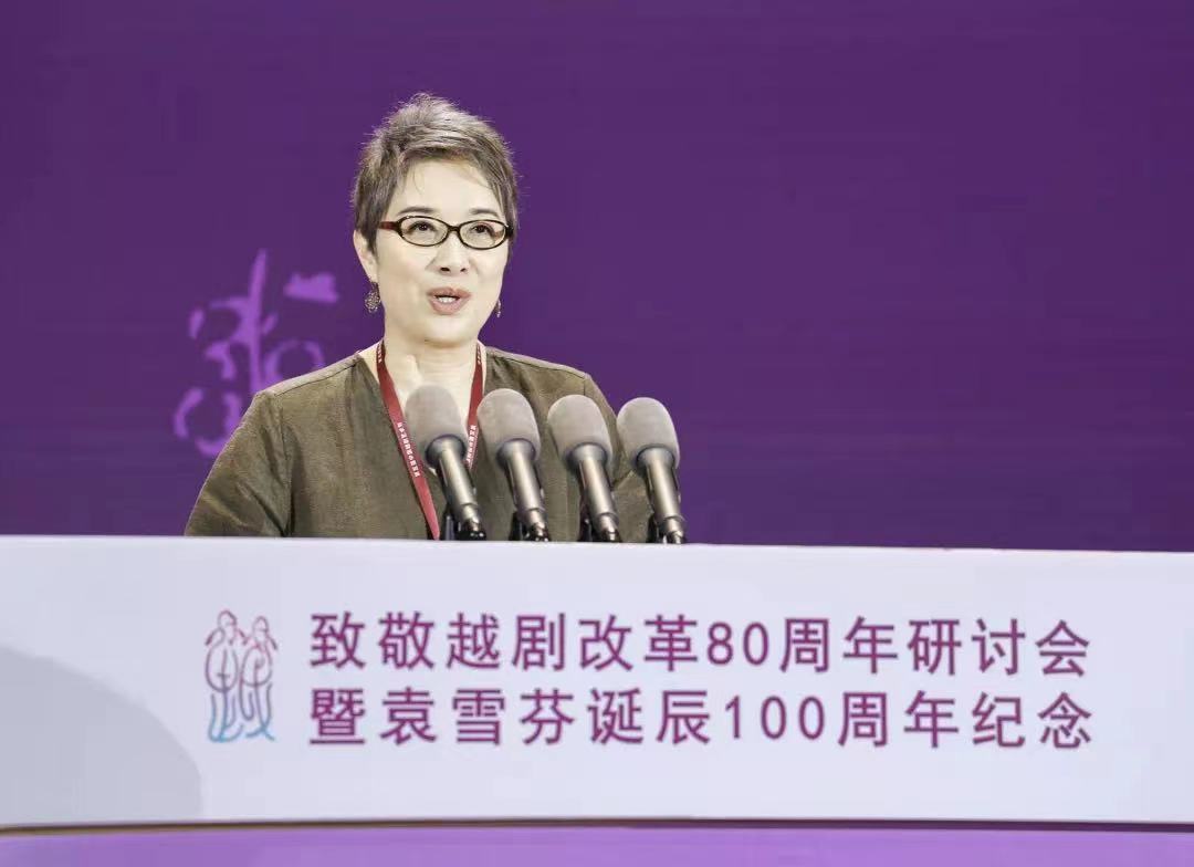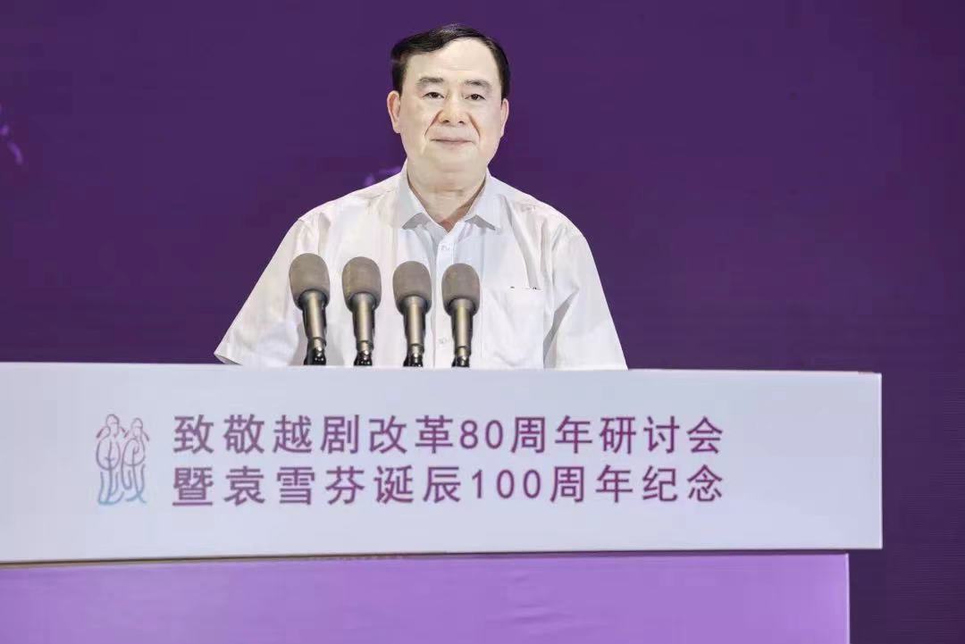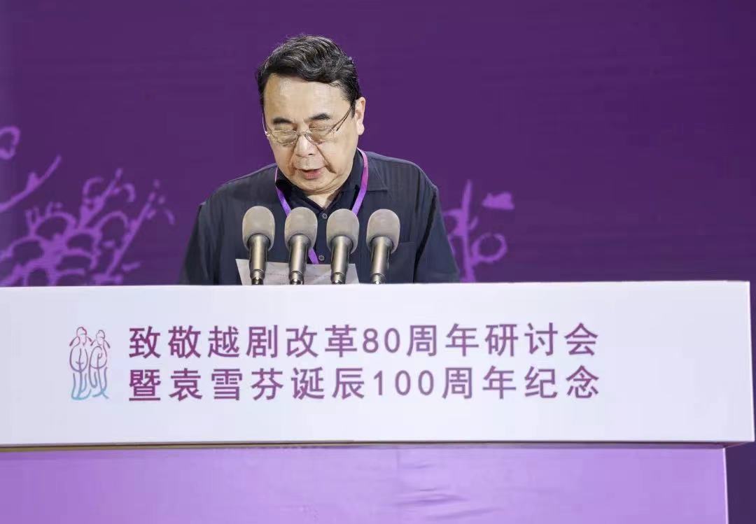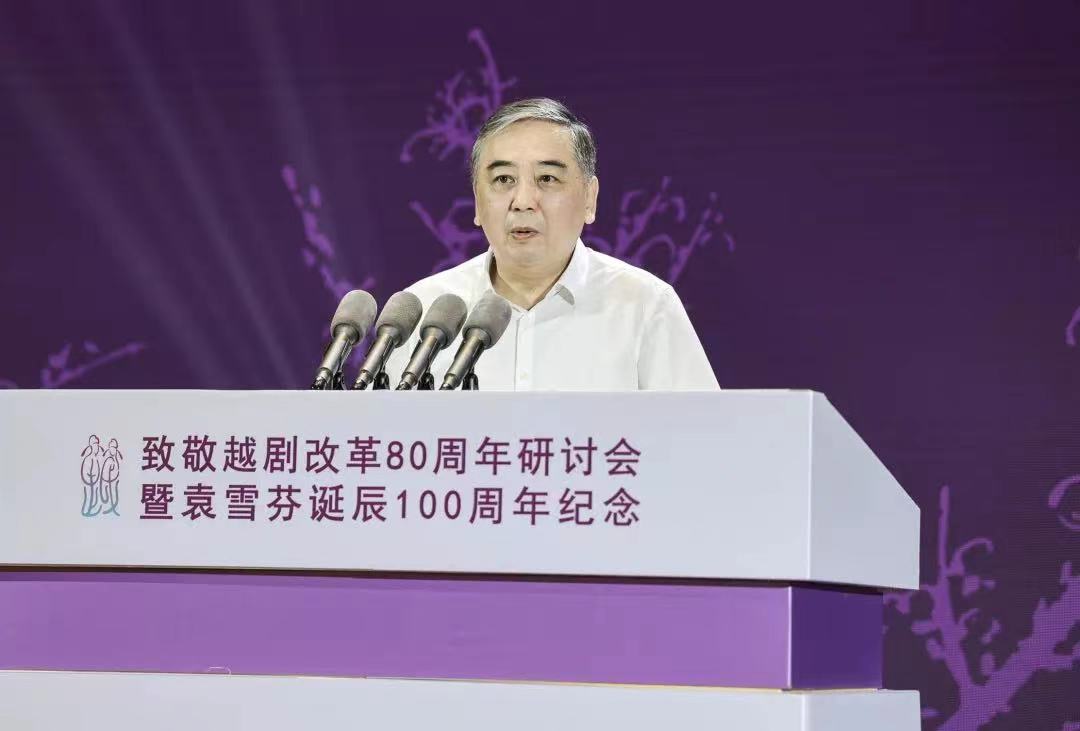 中国文联党组成员、副主席俞峰在致辞中指出,越剧是中国戏曲艺术的重要瑰宝,承载着江南浓郁的乡情乡韵,体现出委婉优雅的艺术风格,深受广大观众喜爱。越剧百年发展的经验,就在于自觉地与时代紧密相连、与社会和观众息息相关,特别是在审美追求上与时俱进。袁雪芬同志恰恰是越剧改革前行的自觉践行者和不懈追求者。温故是为知新,缅怀是为励志,纪念是为前行。我们应该时刻牢记习近平总书记提出的文艺与时代和人民的关系,自觉在戏曲创作演出中践行“以人民为中心”的创作导向;时刻牢记改革和前行是艺术发展动力的历史规律,开阔视野,解放思想,守正创新;时刻牢记习近平总书记《在中国文联十一大、中国作协十大开幕式上的讲话》中对艺术家德艺双馨的殷切希望,认真学习以袁雪芬同志为代表的艺术大家的高远情怀、崇高品德、博大境界,树立文艺工作者的责任感、人民艺术家的使命感。站在越剧改革80周年的历史节点上,希望并祝愿越剧事业和越剧工作者始终以弘扬中华优秀传统文化为己任,持续推动越剧艺术创造性转化和创新性发展,在越剧艺术和越剧产业发展领域唱响故土情怀、演绎时代新韵,为我国越剧艺术事业的繁荣发展作出新的更大贡献。