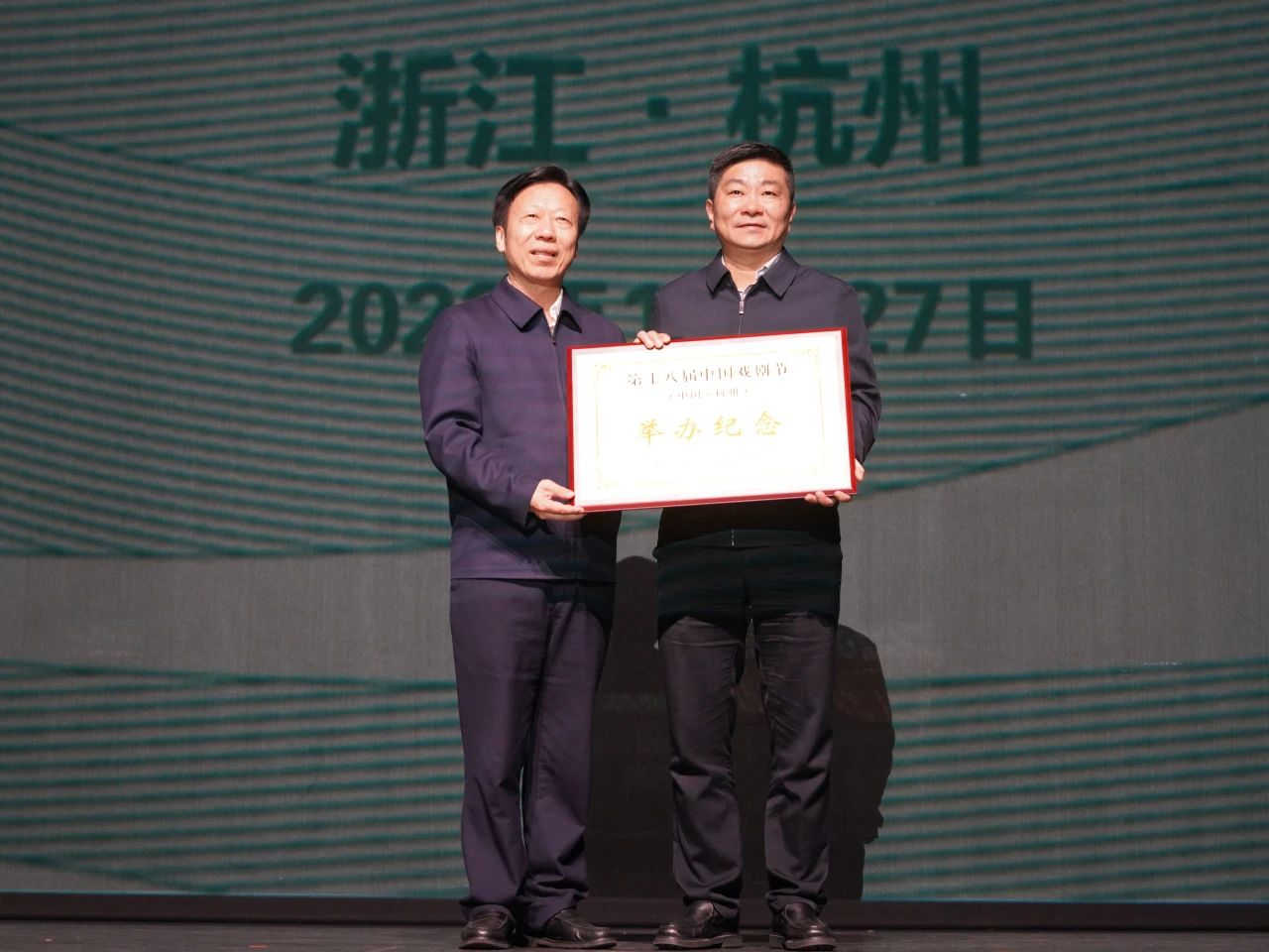 中国剧协分党组书记、驻会副主席陈涌泉向杭州市委常委、宣传部部长黄海峰颁发“第十八届中国戏剧节举办纪念牌”,并在主办城市交接旗环节中,将中国戏剧节节旗郑重交给杭州市委常委、宣传部部长黄海峰,第十九届中国戏剧节继续在杭州举办。