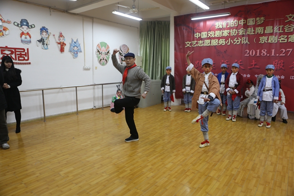 1月25至28日,中国剧协梅花奖艺术团小分队来到江西南昌开展“我们的中国梦·文艺进万家”系列活动。图为艺术家对学生进行戏曲辅导。