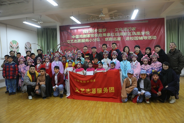 1月25至28日,中国剧协梅花奖艺术团小分队来到江西南昌开展“我们的中国梦·文艺进万家”系列活动。图为艺术家们与凤凰学校的师生们合影。